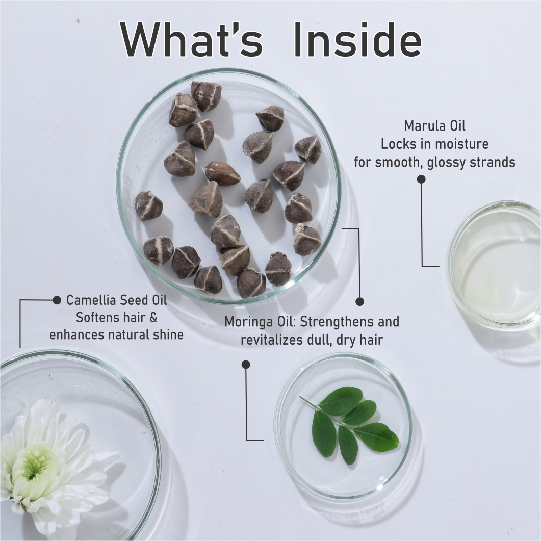 Infused with Marula Oil, Moringa Oil & Camellia Seed Oil this hair serum delivers smoothness, manageability, and natural shine. It helps reduce frizz, strengthen strands, and protect against humidity for hair that feels light and polished.